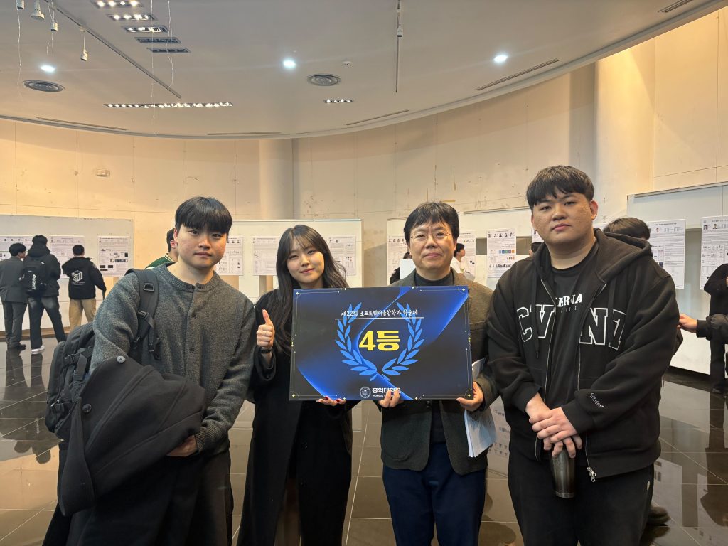학부연구생 학과학술제 4등 수상글쓴이 web manager / 2025년 11월 11일 주제: 실시간 기반 폭행-실신 감지 및 자연어 보고 순찰 드론 김유나, 이성진, 정현욱 (가나다순) 축하합니다!